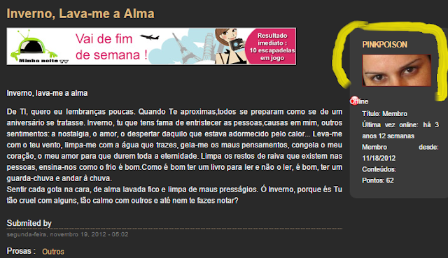 O texto sobre o Inverno foi escrito por mim em 28/9/08 aqui no blog . Uso-o para me inscrever em alguns concursos, como este: http://www.worldartfriends.com/pt/club/prosa/inverno-lava-me-alma ,  saiu da  da minha cabecinha. Veio cá a minha stalker dizer que é plágio. Não é seu abutre. O link que me deste fui eu quem lá pôs o texto. Get a fucking life